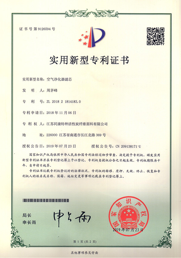 專利證書空氣凈化器濾芯