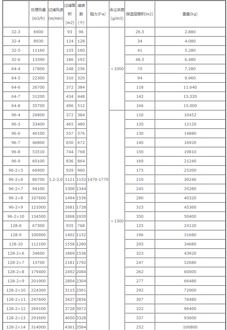 本系列產(chǎn)品共有33種規(guī)格,每室的袋有32、64、96、128袋四種,濾袋長度有2450mm和3060mm兩種,收塵效率可達(dá)99.9%以上,凈化后氣體的含塵濃度小于50mg/m3(標(biāo))本系列收塵器如用于寒冷地區(qū),當(dāng)室外采暖計(jì)算溫度≤-25℃時(shí),要設(shè)熱裝置。