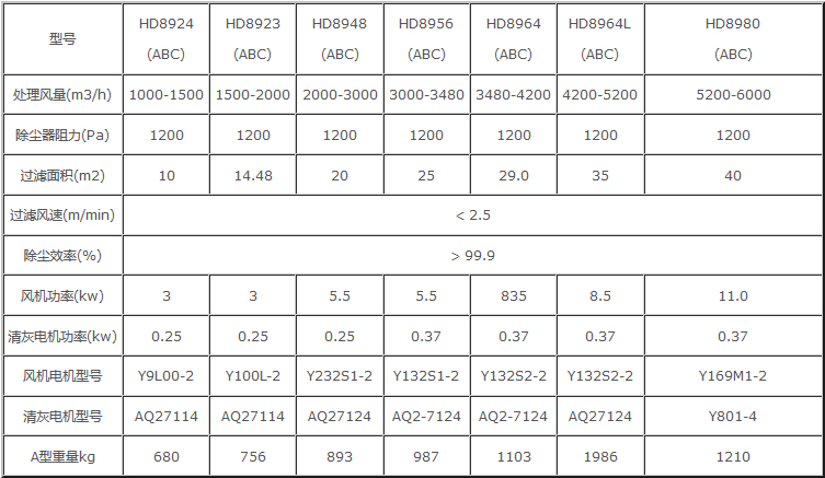 分A、B、C三型,A型設灰門、B型設抽屜,C型既不設灰門也不帶抽屜,下部加法蘭根據用戶要求直接配接在庫頂、料倉、皮帶運辦機等揚塵設備上就地除塵,粉塵直接回收。