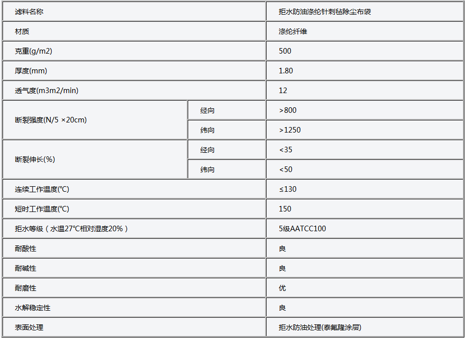 拒水防油針刺氈除塵布袋采用反應型氟化物助劑對滌綸、丙綸、防靜電針刺氈、芳綸針刺氈等各種濾料,通過不同的表面化學處理使工作液與濾料纖維大分子結構中某些基團起反應,形成大分子鏈,改變纖維與水、油的親和性能,使濾料的表面張力降低,降到小于水和油的表面張力,以達到防水、防油性能,濾樣表面和水、油接觸后不易浸透。相比普通濾料,濾料經拒水防油劑處理后,能圍繞纖維表面形成分子屏障,可防止水及各種油污物沾附和滲透,不僅拒水防油特性顯著,對粉塵而言,還具有抗粘結性和易于剝離性。品牌拒水防油針刺氈除塵布袋拒水防油等級試驗達到國家標準,且不影響原來針刺氈的外觀風格和內在指標。